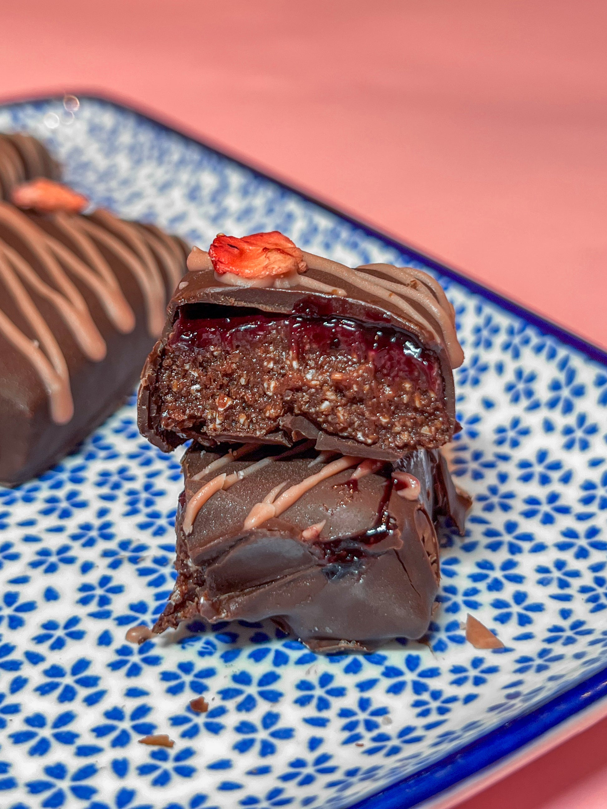 Състав: суроватъчен протеин, какао, безглутенови овесени ядки, кокосово брашно, фъстъци, агаве, ягоди, боровинки, ванилия, ябълков сок, желиращ агент: плодов пектин, какаова маса, какаово масло.